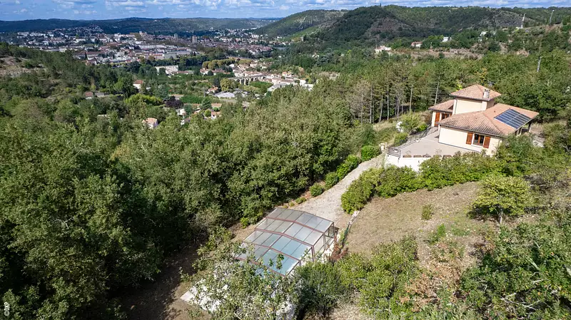 CAHORS, EXCLUSIVITE. Sur les hauteurs au calme avec une vue imprenable maison contemporaine avec piscine d'une surface habitable d'environ 148 m² sur un terrain de 10,655 m² proche du centre-ville, RDC, Entrée, séjour avec cheminée insert, donnant sur une belle terrasse avec une vue imprenable sur cahors, cuisine équipée, 3 chambres., salle de bains, wc. Etage : bureaux. Rez de jardin : appartement d'environ 46m² : séjour avec cuisine ouverte, salle d'eau, chambre. Garage, cave, atelier, buanderie, débarras. La piscine de 4x8m au sel avec son abri. Chauffage électrique, climatisation réversible dans séjour et chambres , cheminée insert. Fenêtres bois double vitrage. Volets bois. Panneaux photovoltaïques production revendue à Inedis (environ 1800 €/an). Assainissement individuel conforme. Les informations sur les risques auxquels ce bien est exposé sont disponibles sur le site Géorisques www.georisques.gouv.fr