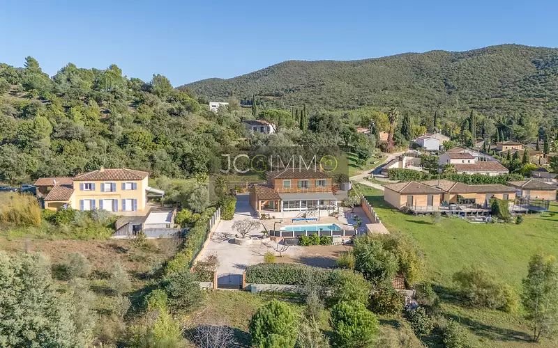 Une grande véranda de 40 m2, entièrement vitrée, pensée comme une pièce à vivre ouverte sur la nature. Elle offre une vue splendide sur le Massif des Maures et un accès direct à la piscine.