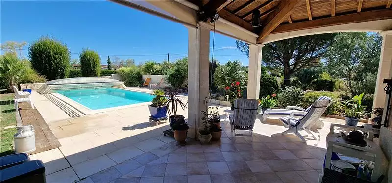 Commodités à pied pour cette maison contemporaine offrant : Entrée, cuisine, salon/séjour, trois chambres, salle d'eau, salle de bains, wc, arrière cuisine. Terrasse couverte, terrain d'environ 2700m² avec puits et piscine.