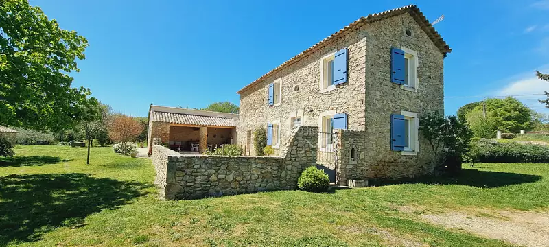 En Exclusivité! Situé entre l'Uzège et la vallée de la Cèze, découvrez ce magnifique mas entièrement rénové sur les hauteurs d'un village, sur un terrain de plus d'1ha3 avec oliviers, chênes truffiers, citronniers... La partie principale est composée par une grande pièce de vie d'environ 55m², avec cuisine équipée, wc, donnant directement sur un belle cour fermée avec cuisine d'été (28m²) côté sud et sur une deuxième terrasse côté nord (très pratique lors des grandes chaleurs!). L'étage est desservi par un escalier en pierres de tailles, donnant sur une chambre, un côté bureau , une deuxième grande chambre avec terrasse et une belle salle de bain. De plus un gîte d'environ 40m² indépendant, tout confort , idéal pour recevoir famille et amis. Climatisation réversible dans les deux logements, DV Bois fait sur mesure, Volets Alu, Forage, tout à l'égout , cave de 19m², atelier de 10m², abris, piscinable et possibilité d'agrandir.