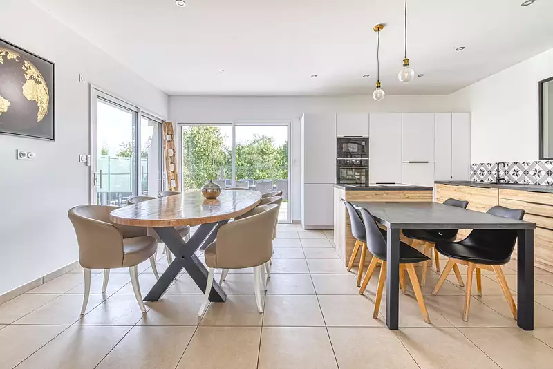 Offre d'achat acceptée ! SAINT-BARTHELEMY-D'ANJOU, parc de Pignerolles, en EXCLUSIVITE, maison construite en 2023, principalement de plain-pied, offrant au rez-de-chaussée une entrée, une très belle cuisine équipée ouverte sur un salon-séjour avec poêle à bois (environ 56 m2), 3 chambres parquetées, salle de douche, chaufferie-cellier. A l'étage, vous bénéficiez de 2 charmantes chambres parquetées et d'une salle de bains. Grenier aménageable de plus de 100 m2 au sol. Garage carrelé d'environ 50 m2. Terrasse carrelée. Ce bien d'exception est réalisé avec de très belles prestations : aspiration centralisée, chaudière mixte (PAC + gaz)... Le tout sur un terrain paysagé entièrement clos d'environ 690 m2.