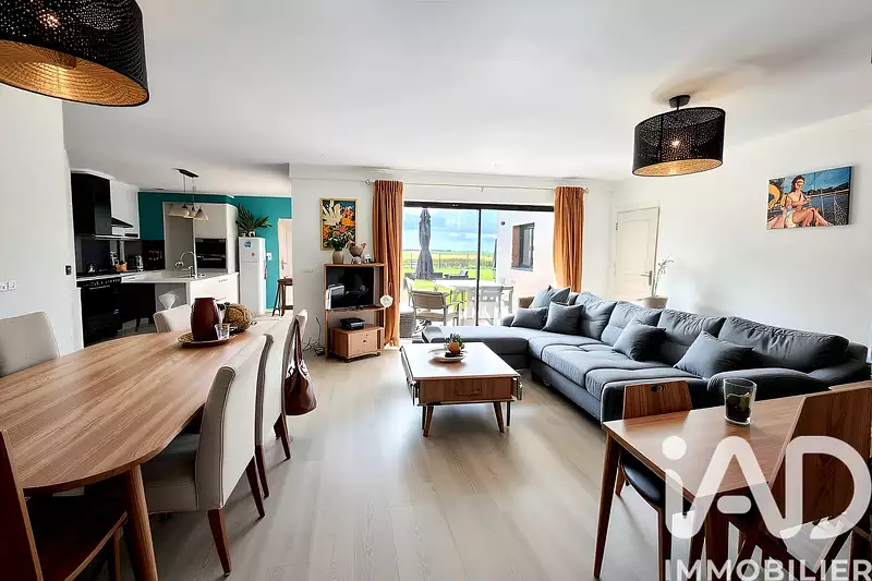 La pièce de vie lumineuse de 70 m², regroupant salon-séjour et cuisine équipée, offre un espace convivial idéal pour partager des moments en famille ou entre amis.