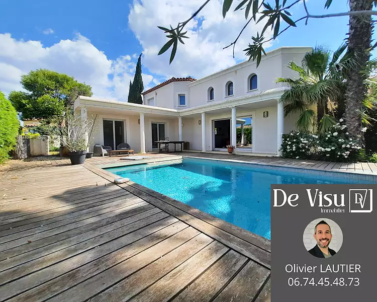 148m² // 4 chambres // Piscine // Garage Dans l'environnement privilégié et calme d'un secteur recherché du village de Villeneuve lès Maguelone, votre agence vous propose les 148m² habitables de cette belle villa offrant un cadre de vie sur le pourtour du littoral méditerranéen des plus agréable. Sur une parcelle de 660m², cette maison baignée de lumière, vous séduira par ses prestations et ses matériaux de qualité : baies alus, volet roulant électrique, séjour cathédrale, piscine, garage avec portail électrique, baignoire à jet, adoucisseur d'eau, forage, nombreux rangements... La maison propose au rez-de-chaussée une grande pièce de vie de 54m², un cellier attenant à la cuisine, deux belles chambres avec placard, une salle de bain et un WC séparé. A l'étage une master suite de 23m² avec dressing, salle d'eau et bureau ouvrant sur un toit terrasse. Cerise sur le gâteau : vous découvrirez au rez-de-chaussée une petite dépendance de 14m² avec salle d'eau et entrée indépendante, idéale pour une chambre d'ado ou pour accueillir amis et famille. L'extérieur arboré et calme vous offre une belle terrasse couverte exposée plein sud et une grande piscine sécurisée avec espace détente intimiste. Un garage de 15m² et plusieurs places de stationnement privatives sur la parcelle viennent agrémenter l'ensemble. Ce bien RARE est à découvrir rapidement ! Contact au O6.74.45.48.73. (5.00 % honoraires TTC à la charge de l'acquéreur.)