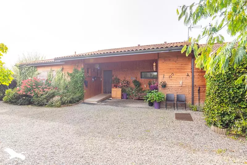 Maison en bois de plain-pied –alliant calme et confort. Laissez-vous séduire par sa grande pièce de vie lumineuse, sa cuisine ouverte équipée, idéale pour convivialité et moments en famille. Fonctionnelle et agréable à vivre, cette maison s’intègre parfaitement dans un environnement paisible et une vue imprenable sur les Pyrénées.