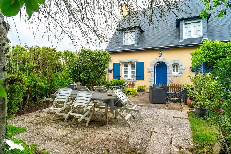 Non loin du bourg, sur la route des plages, découvrez cette jolie néo-bretonne édifiée sur sous-sol total. Cuisine aménagée fermée, spacieux salon-séjour, vie de plain-pied avec chambre et salle de bains et WC séparé. A l'étage, trois chambres, bureau, dressing et salle de bains. Grand garage indépendant pour bricoler. Beau jardin.