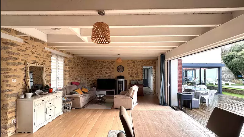 PORNICHET à seulement 450 mètres du marché, maison de 1906 en pierre, entièrement rénovée en 2017 se composant d'une belle pièce de vie sur parquet avec poêle à pellets et grande baie à galandage donnant sur terrasse plein sud, cuisine aménagée et équipée donnant sur véranda chauffée, arrière cuisine/buanderie, suite parentale avec dressing et salle d'eau, toilettes. A l'étage : 3 chambres sur parquet d'origine, toilettes, salle d'eau. Jardin clos d'environ 300 m2 avec piscine, garage et deux places de stationnements. Vous serez séduit par ce bien alliant le charme de l'ancien et le contemporain ainsi que sa proximité des plages et des commerces. (3.52 % honoraires TTC à la charge de l'acquéreur.)