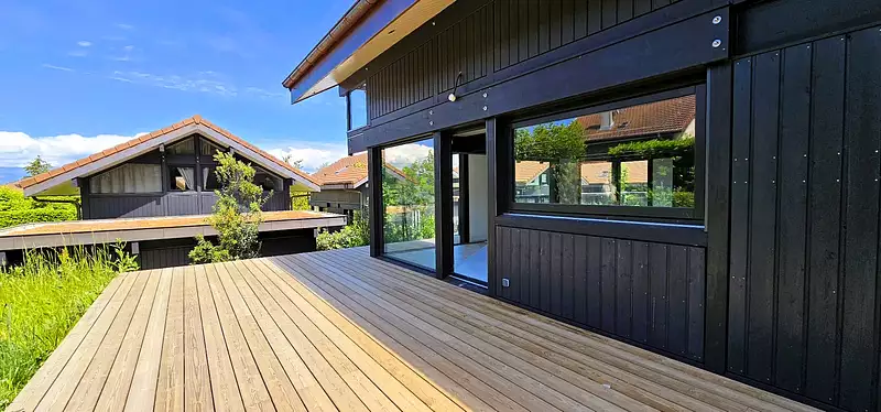 BOSSEY 74160 - Sublime maison très récente sur les hauteurs du village d’une superficie habitable de 150 m2 sur sous sol complet. Située dans un, lotissement résidentiel entièrement végétalisé., à découvrir sans tarder cette maison en bois contemporaine « constructeur reconnu et réputé Maison Dunoyer » bénéficie d’une vue panoramique sur le Jura, le Genevois et le lac Léman en toile de fond.