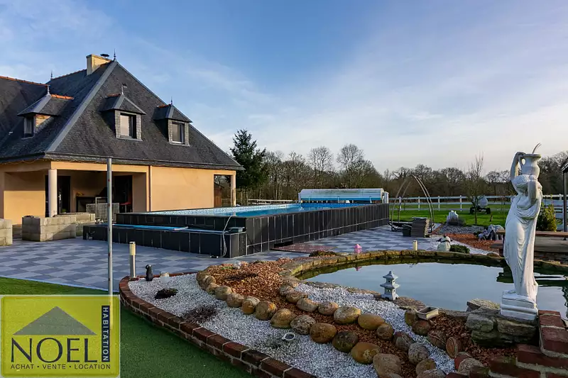 A 20 Mn de Saint Malo et 25 mn de Rennes, au fond d'une impasse d'un hameau au calme, superbe propriété contemporaine construite en 2007 comprenant au rez-de-chaussée, une entrée/bureau, un grand séjour salon avec poêle à bois alsacien, une grande cuisine ouverte équipée et aménagée, une suite parentale, un vestiaire, une buanderie, une cave à vin et une cave à fruits et légumes, un wc, un double garage et un atelier. A l'étage, une mezzanine dessert trois chambres, une salle de billard, une salle de bains, un wc et possibilité d'aménager une grande pièce de 80 m² au dessus du garage.. Une piscine chauffée (10 m X 4 m), une grande terrasse couverte. Le tout sur parc d'environ 1,8 hectares. Excellentes prestations. (4.00 % honoraires TTC à la charge de l'acquéreur.)