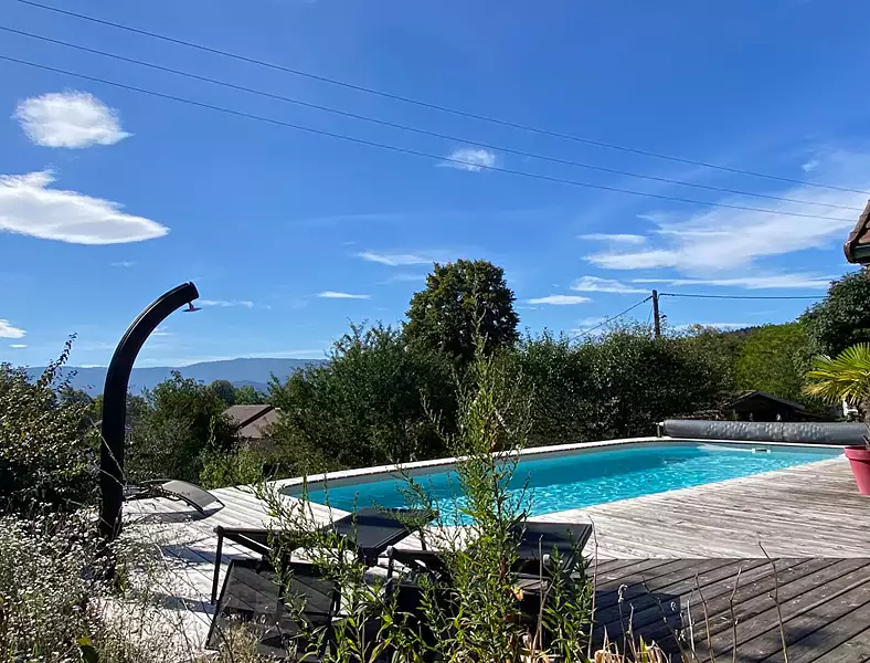 Imogroup a le plaisir de vous présenter cette maison nichée dans le charmant village d'Échallon, à 800 mètres d'altitude, cette maison construite en 2001 bénéficie d'un environnement privilégié, ensoleillé et ouvert sur la vallée entre Oyonnax et Valserhône, à seulement 15 minutes de l'autoroute et 45 minutes de Genève, elle combine le calme d'un cadre naturel avec la proximité des grands axes pour rejoindre Lyon ou la Suisse. Le village offre une qualité de vie rare : école maternelle et primaire, petite épicerie, convivialité villageoise et nature omniprésente. Les environs regorgent de balades et de sentiers, notamment autour du lac Genin surnommé « le petit Canada » où l'on profite des beaux étés comme des randonnées en toutes saisons. La maison, édifiée sur un terrain de près de 1 500 m², séduit par ses volumes et son art de vivre tourné vers l'extérieur. La pièce de vie réunit cuisine, salle à manger et salon autour d'une cheminée à foyer fermé. La cuisine, équipée d'un grand piano, s'ouvre naturellement sur la terrasse en bois et sur la piscine chauffée installée en 2018, parfaitement intégrée au décor. C'est un véritable lieu de détente, idéal pour partager des moments en famille ou entre amis, tout en admirant le panorama. Le rez-de-jardin comprend également deux chambres, dont une avec dressing, une salle d'eau équipée d'un sauna trois places et un WC séparé. A l'étage, une mezzanine distribue deux chambres supplémentaires ainsi qu'une salle d'eau et un second WC. Un vaste sous-sol d'environ 100 m² complète l'ensemble, avec garage, buanderie, cave à vin et rangements. Chauffée par une pompe à chaleur air/eau (2008), la maison bénéficie du confort du chauffage au sol sur les deux niveaux, avec des dépenses énergétiques remarquablement contenues. Un cadre de vie rare et recherché : la tranquillité d'un village haut perché, baigné de soleil, alliée à la proximité des commodités, de Genève, de Lyon et de superbes espaces naturels.