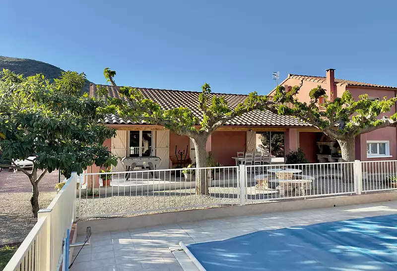 Village Salelles du Bosc, 35 mn de Montpellier et de Bèziers par accès direct A75. Agréable VILLA de plain pied avec annexe R+1 attenante et communiquante pour un total d'envion 150 m2 habitables sur parcelle de 1 134 m2 constructible. Garage indépendant avec local technique d'environ 30 m2. Piscine carrelée de 8,5X4,5 entièrement sécurisée. Grand jardin avec joli bassin d’ornement et ses carpes Koï. Boulodrome ombragé et éclairé. La maison comprend un espace de vie avec cuisine américaine d'environ 48 m2 ouvrant sur terrasse couverte d'envioron 40 m2, trois chambres, une salle d'eau à l'italienne avec WC et un WC indépendant. La partie annexe du rez de chaussée comprend un couloir desservant un séjour/cuisine, une salle d'eau / WC et un cellier. Au 1er étage de l'annexe: deux chambres, un bureau et WC indépendant. Nombreuses plantations et jardin potager avec arrosage automatique. Portail entrée automatique. Pompe à chaleur. Ce bien a été rénové avec des matériaux de qualités. Aucun travaux à prévoir !