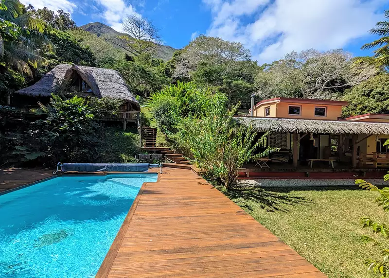 Situé en position dominante, au pied du Mont Dore et en impasse, villa en maçonnerie d'environ 150m², un patio de 60m², une terrasse couverte de 50m² et une piscine avec deck et faré. Le bien dispose également d'un Faré Mélanésien traditionnel de 45m², aménagé avec une salle d'eau, WC et une chambre. Un bungalow supplémentaire de 16m² et un atelier complètent le bien. Le tout bâti sur un magnifique terrain de 50 ares.