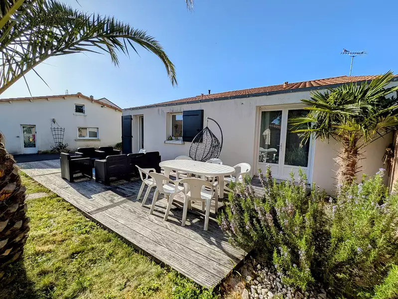 Seulement dans notre agence, jolie maison atypique de 107 m2 avec une spacieuse dépendance habitable à 15 mns à pied du centre-ville et de la plage. Rénovée avec goût, la maison dispose d'une bonne distribution :