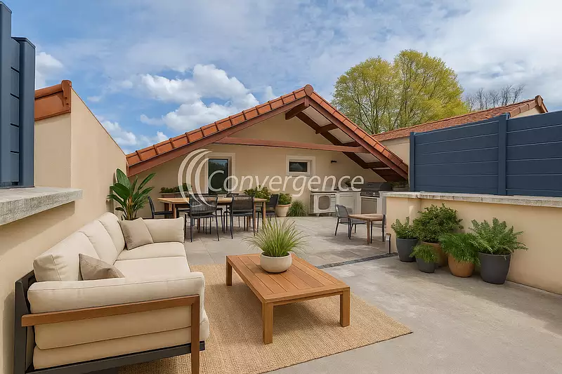 RARE à la vente ! En centre-ville de Limoges et à l'abri des regards, magnifique maison de type LOFT de 150m2 intégralement rénovée avec goût en 2022, avec 2 garages et une terrasse de 60m2 sans vis-à-vis.