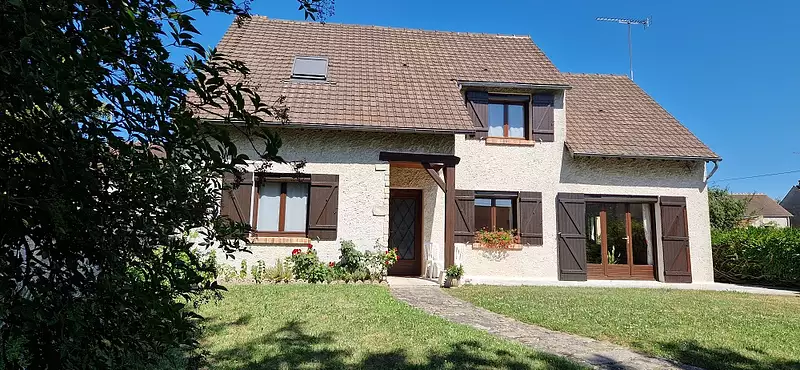 MAISON SUR SOUS-SOL TOTAL 150 m² hab. - Terrain 850 m² - 5 chambres dont 1 en rdc Une bonne construction qui vous offre un agencement idéal avec une vie de plain-pied. Vestibule, salle-à-manger salon avec cheminée, cuisine indépendante, cellier, une chambre, salle d'eau et toilette. Etage : palier, une chambre avec mezzanine, wc, salle-de-bains, pièce palière, trois chambres. S/sol divisé en dégt, bureau, chaufferie, cave, double garage/atelier. Jardin clos. située au calme à proximité de toutes commodités. LUMINEUSE Informations sur les risques disponibles sur le site ww.georisques.gouv.fr