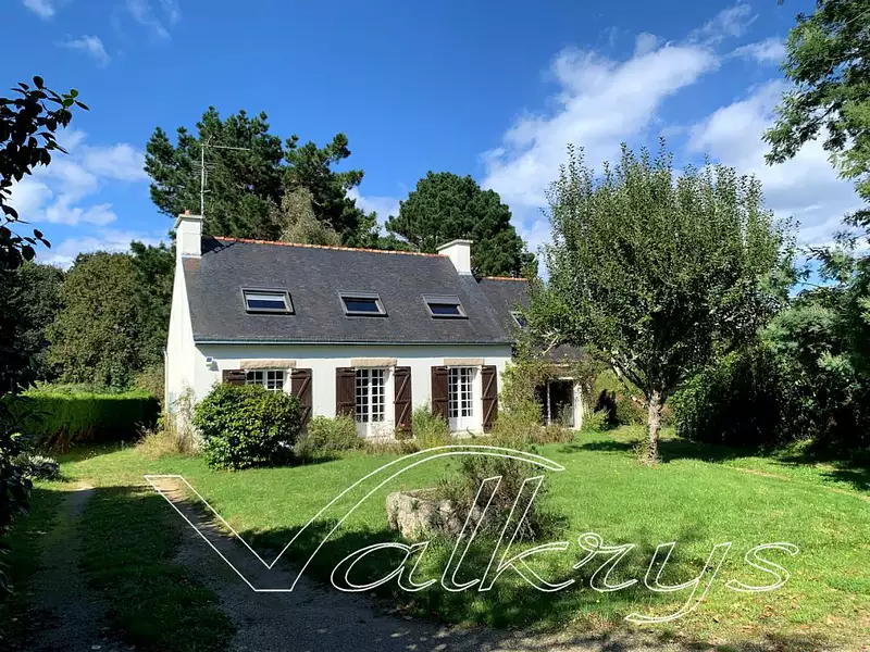 Maison néo-bretonne 150 m2, en retrait et au calme, commodités à pied et proximité 1,5km des plages. Accès allée verte en fond de jardin pour descendre au port à pied. Vie de plain-pied agrémentée d'une grande véranda donnant sur le jardin, agréable à tout moment de la journée.