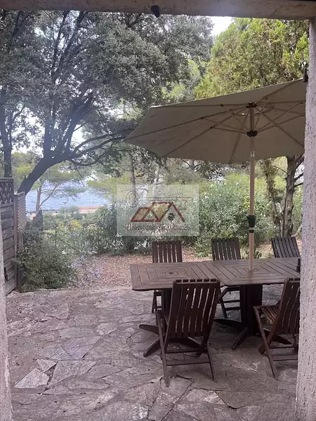 Le jardin est arboré de pins et d'oliviers centenaires et bénéficie d'une vue mer.