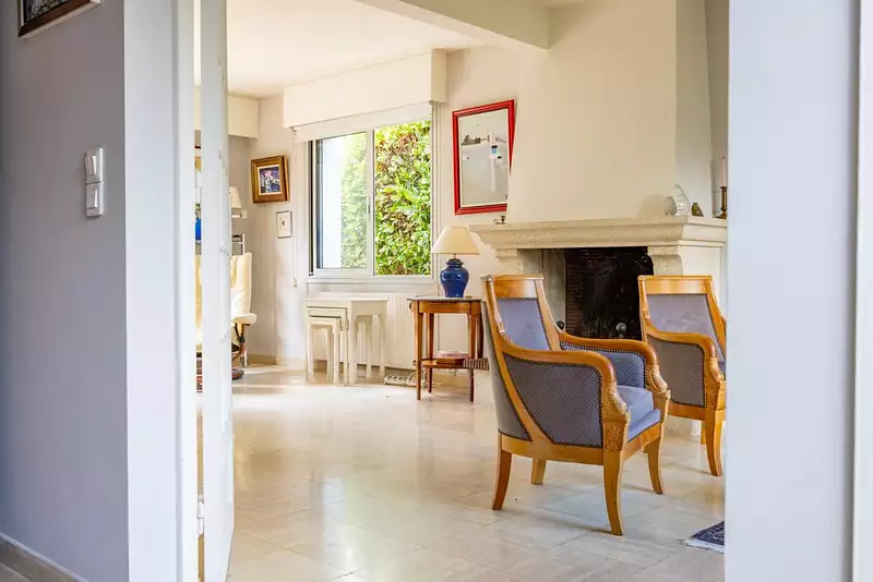 Au RDC, un salon séjour lumineux et traversant avec cheminée, une cuisine A/E, une chambre, une arrière-cuisine, une salle d'eau, WC.