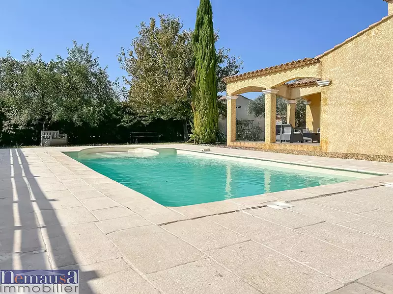 Rémi TESTARD Nemausa Immobilier La Gazelle vous propose cette villa à vendre à Redessan, à seulement 10 minutes de Nîmes, proche autoroute A9 et Gare TGV de Manduel. 150 m2 habitables (dont un studio indépendant de 30 m2) sur terrain clos plus de 800 m2, avec piscine au sel, pool-house de 50 m2 et terrasse. Maison chaleureuse et conviviale, idéale pour vie familiale et revenus locatifs attractifs.