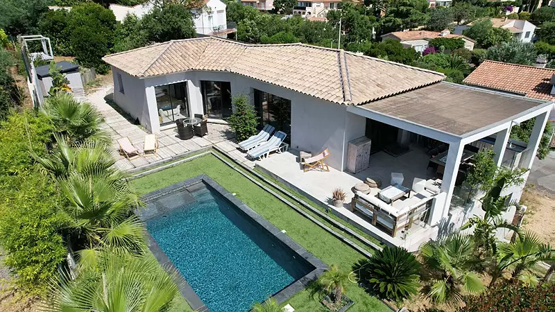 Magnifique propriété aux lignes contemporaines, à pied du centre-ville de Saint-Aygulf, offrant un cadre de vie calme. Elle propose une spacieuse pièce de vie exposée sud avec cuisine américaine et de grandes ouvertures en baies vitrées donnant sur une terrasse couverte avec cuisine d'été, ainsi que sur la piscine. Une suite parentale complète cet espace. Au niveau inférieur, on retrouve deux chambres avec portes-fenêtres, une salle de bain, une buanderie ainsi qu'une pièce annexe de 35 m² pouvant être aménagée en salle de cinéma. Cette villa offre de belles prestations telles que des baies vitrées en aluminium double vitrage, volet roulant, alarme, une climatisation réversible gainable et un boulodrome. Un studio avec entrée indépendante de 35 m² complète cette propriété, idéal pour loger de la famille ou pour une rentabilité locative N'hésitez pas à nous contacter pour organiser rapidement une visite !