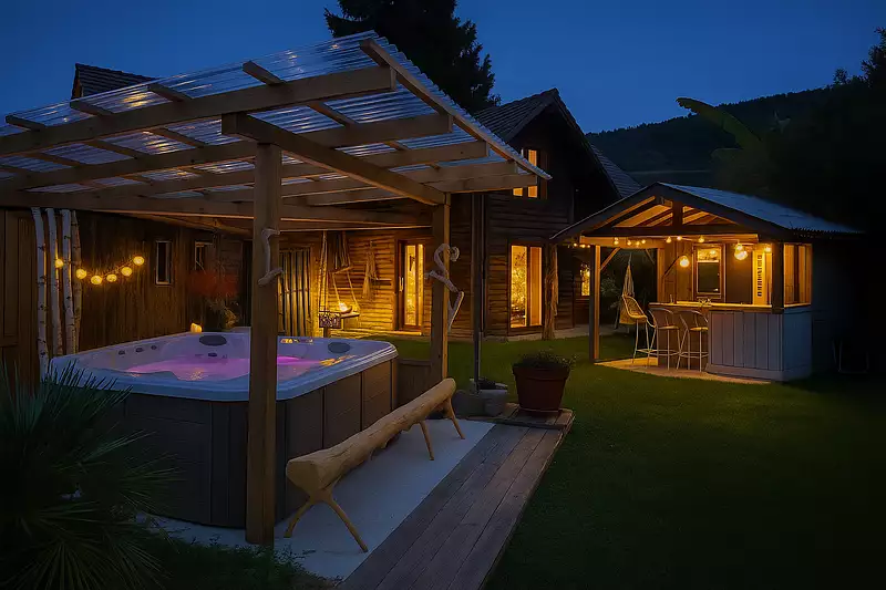 Pour profiter pleinement des beaux jours, vous trouverez un jacuzzi abrité, une terrasse avec coin repas et bar extérieur, propices à des moments de détente et de convivialité.
