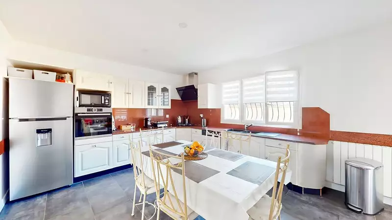 Elle se compose au rez-de-chaussée d'une entrée spacieuse avec rangements, d'une grande pièce de vie lumineuse incluant une salle à manger, et d'une cuisine équipée avec un accès direct à l'extérieur. Un WC indépendant complète ce niveau.