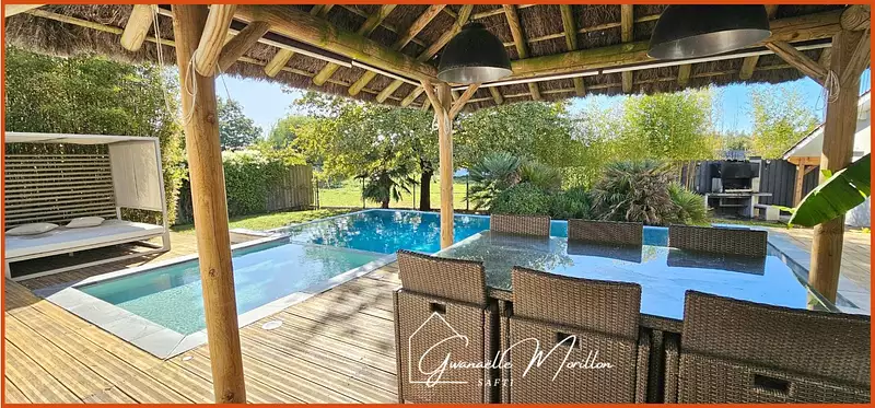 La vaste terrasse en bois avec sa paillote, la piscine à débordement chauffée offrant 2 espaces distincts : l’un pour la baignade, l’autre pour la relaxation, l' espace barbecue... Tout invite à la détente, dans une atmosphère intime et apaisante...