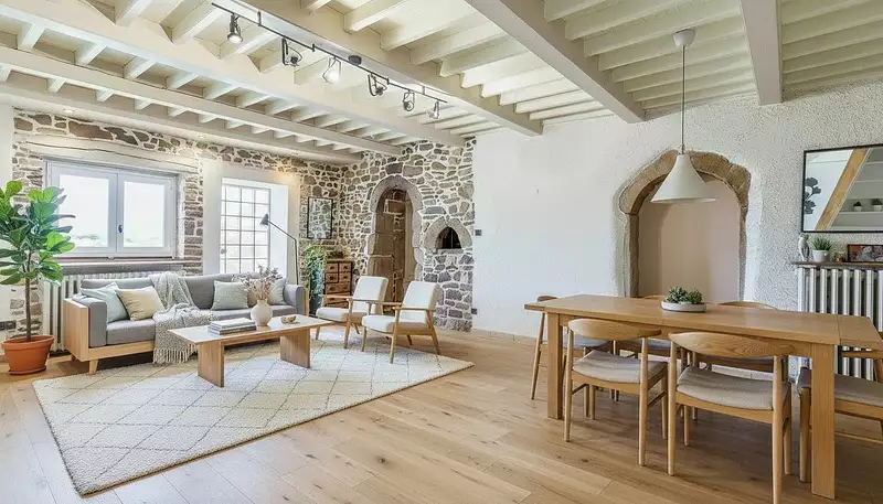 Dès l'entrée, le séjour traversant de 32 m² s'impose comme le coeur de la maison. Lumineux grâce à ses nombreuses ouvertures orientées sud-est, il révèle ses poutres apparentes et son mur en pierre, sublimés par un poêle à bois pour une atmosphère chaleureuse et authentique. Dans son prolongement, la cuisine indépendante (12 m²) aménagée et équipée s'organise autour de nombreux rangements et d'une vue directe sur le jardin.