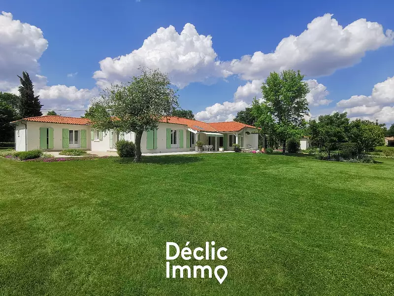 Située aux portes de Niort, dans un hameau, à 8 minutes de l'entrée de l'autoroute A10 (Paris-Bordeaux), à 7 minutes de la zone commerciale, cette maison offre à la fois la proximité des points d'intérêts, et la tranquillité d'une maison de campagne. La parcelle de 15 700m², comporte 6 600m² non-constructibles, plantés de peupliers, le reste est cosntructible. Elle peut être divisée en 2 parcelles ce qui laisserait 4000m² autour de la maison. Cette belle maison compte 150 m² habitables de plain-pied. Elle se compose d'une cuisine spacieuse, d'un beau salon séjour de 42 m², d'un wc et d'une buanderie. La partie nuit comporte 3 chambres de 11 et 13m², d'un bureau de 11 m², d'une salle de bain et une pièce salle de sport. Un double garage de 60m² complète la maison. A l'extérieur, vous trouverez également un préau pouvant abriter plusieurs voitures, une terrasse carrelée, une belle cour, ainsi que deux dépendances de 25 et 37 m². Pour de plus amples renseignements sur ce bien, contactez moi. Réf 2498. DECLIC IMMO 79 DPE : E Les informations sur les risques auxquels ce bien est exposé sont disponibles sur le site Géorisques : www.georisques.gouv.fr. Annonce proposée et rédigée sous la responsabilité éditoriale de TROUVAT Olivier - 06 69 05 74 86 - - Agent Commercial RSAC N° 900 845 470 Ville du greffe : NIORT Honoraires : 19 800 € TTC (6 %) inclus charge acquéreur (330 000 € hors honoraires) Prix moyens des énergies indexés sur les années 2021 2022 2023 (abonnement compris). Montant estimé des dépenses annuelles d'énergie pour un usage standard : entre 3 690 € et 5 080 € par an.