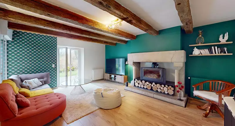 Dès l'entrée, le salon séduit par sa magnifique cheminée, ses poutres apparentes et son escalier en châtaignier, qui soulignent le caractère chaleureux et authentique des lieux.