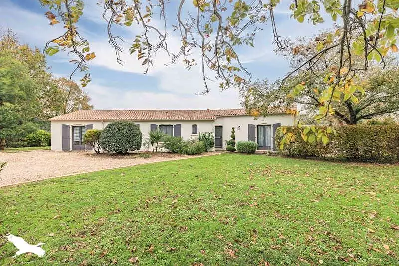 Maison de plain pied lumineuse de 152m² offrant deux chambres, une suite parentale, une cuisine-véranda équipée, un séjour-salon avec cheminée foyer fermé, un cellier, un bureau. Un garage, pergolas et terrasse ainsi qu'une piscine bois chauffée semi enterrée. Joli jardin paysagé et clos d'environ 2000m² avec portail motorisé.