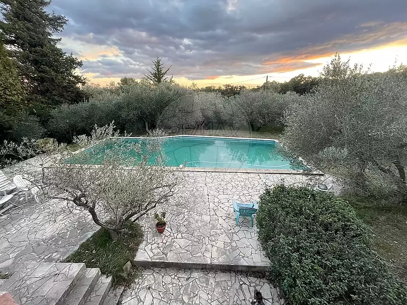 L'agence RE/MAX PROPERTIES GALLOUÉDEC Immobilier vous présente en exclusivité cette maison de 153m² sur un terrain de 3 685m² avec une piscine, un garage et une petite oliveraie située à Sommières.