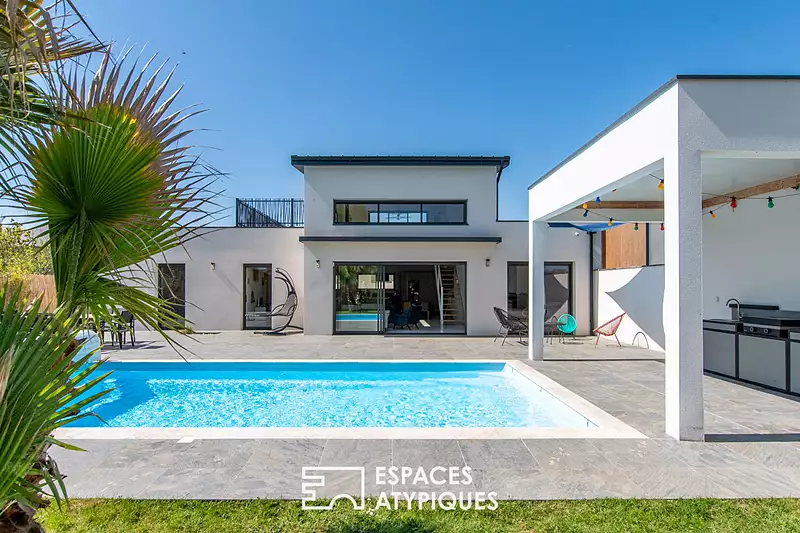 Située dans la ville dynamique de Saint-Barthélemy-d'Anjou, aux portes d'Angers, cette maison récente aux lignes épurées déploie environ 153 m² de surface habitable. Réalisée en 2020 avec des matériaux de qualité, cette maison contemporaine se distingue par sa luminosité omniprésente et son agencement, offrant un mode de vie confortable au quotidien avec une véritable vie de plain-pied. L'entrée dessert une agréable pièce de vie, composée d'une cuisine ouverte entièrement aménagée et équipée, qui s'intègre harmonieusement à l'espace salle à manger et au salon, créant une ambiance chaleureuse et conviviale. De grandes ouvertures prolongent cet espace vers l'extérieur. De part et d'autre de cette pièce centrale, l'espace nuit offre une suite parentale élégante avec dressing et salle d'eau privative, ainsi que trois chambres supplémentaires accompagnées d'une salle de bains indépendante. L'étage dévoile une mezzanine aménagée en vaste bureau, bénéficiant de sa propre terrasse. A l'extérieur, une belle et vaste terrasse exposée sud-est est agrémentée d'une piscine ainsi que d'une cuisine d'été, pour une ambiance conviviale. Le jardin arboré permet de profiter pleinement des extérieurs. Un garage d'environ 30 m² et un abri de jardin viennent parfaire cette réalisation. Cette maison familiale est située dans un environnement calme, à proximité des commodités essentielles, offrant ainsi un cadre de vie agréable et pratique. A seulement 5 minutes des commerces de la ville et 12 minutes de l'hyper-centre d'Angers. CLASSE ÉNERGIE : A / CLASSE CLIMAT : A Contact : Medhi 06 50 22 64 71 Agent commercial (EI) immatriculé au RSAC de ANGERS sous le numéro 844 792 069. Les honoraires sont à la charge du vendeur. Les informations sur les risques auxquels ce bien est exposé sont disponibles sur le site Géorisques pour les zones concernées : www.georisques.gouv.fr