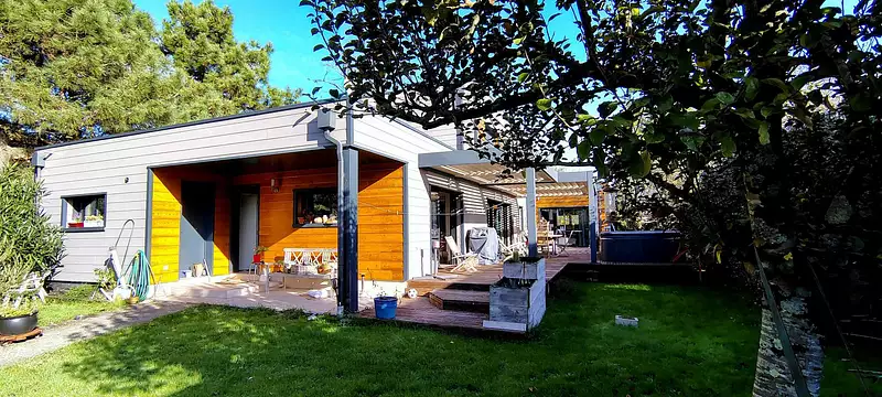 ARVERT - 1 KM COMMERCES - Nichée dans un écrin de verdure à l'abri des regards, maison de 2015 "eco" classée B, poele à granulés, pergola bio-climatique, panneaux solaires, terrasse de plus de 60 m² exposée sud-ouest avec spa, réserve d'eau de 7000L - Pour votre confort bel espace de vie avec cuisine semi ouverte, baies à galandage, vaste suite parentale, bureau, cellier, à l'étage 2 chambres, salle d'eau et wc.