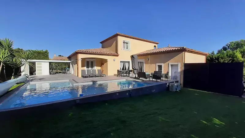 Villa moderne 4 faces de type 5 en semi plain-pied, comprenant 4 chanbres dont 2 en rez-de-chaussée composées d'une suite parentale avec sa salle d'eau et WC indépendant, une cuisine totalement équipée et aménagée ouverte sur un grand séjour lumineux, une salle de bain et un WC séparé. Ce bien profite de menuiseries en PVC double vitrage, de volets roulants électriques et d'une climatisation reversible par splits dans le séjour, la suite parentale et à l'étage. Le tout a été édifié sur une parcelle de terrain de 1003m² clôturée et arborée, avec abri de jardin, proche commerces et commodités et bénéficie d'une piscine de 8m x 4m chauffée par une pompe à chaleur. Belle décoration, matériaux modernes, beaux volumes, trés bonne exposition, peu ou pas de travaux à prévoir. Idéal Famille. Prix TTC et Honoraires à charge vendeur TTC ACCES IMMOBILIER - Tél. + 33 (0)4 68 78 53 20 Plus d'informations sur