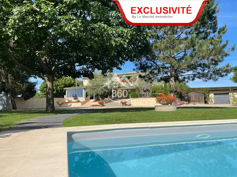 Ce bien d'exception dispose d'un terrain paysagé avec une piscine et sa cuisine d'été pour savourer vos repas en extérieur.
