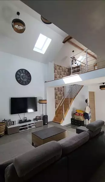 À l'étage, une grande mezzanine, ouverte sur la pièce de vie, vous propose un espace polyvalent, idéal pour vos projets de bureau ou de salle de jeux, tout en préservant la convivialité.