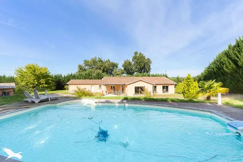 Maison de plain pied, offrant une vaste pièce de vie, un espace nuit avec 4 chambres dont 1 suite parentale et possiblité d'une cinquième. En exterieur 3 garages, un ardin arboré, une piscine desjoyaux. A visiter sans tarder ! Proposition d'aménagement virtuel non contractuelle en dernière photo.