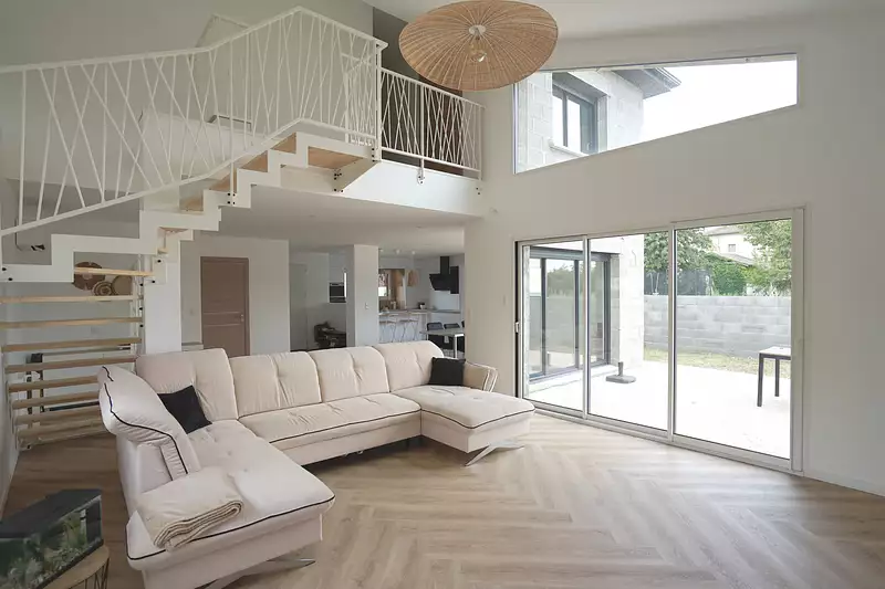 Vous découvrirez au rez-de-chaussée, une cuisine moderne entièrement équipée et aménagée ouverte sur la spacieuse pièce de vie d'environ 58 m2 baignée de lumière avec ses nombreuses baies vitrées en aluminium et volets roulants électriques donnant sur une terrasse pour profiter des extérieurs en toute tranquillité.