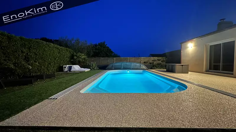 - Terrasse de 100 m2 idéale pour les repas et moments de détente avec piscine couverte et chauffée (pompe à chaleur).