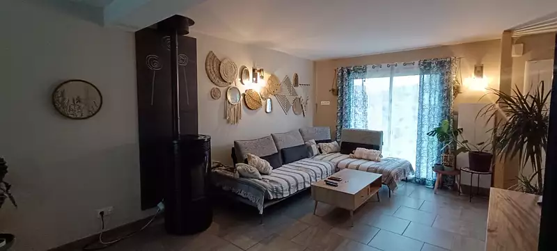 Le rez-de-chaussée propose idéalement une chambre avec salle d'eau, une vaste pièce de vie pourvue d'un poêle à granulés, une cuisine équipée, une arrière-cuisine et un accès au garage.