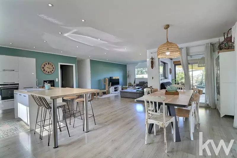 Dès que vous franchissez la porte, vous découvrez une vaste pièce de vie baignée de lumière, où la cuisine ouverte se fond harmonieusement avec l'espace salon-séjour. Ici, vous pouvez déjà imaginer vos moments en famille, partageant des repas autour de l'îlot central ou profitant de soirées chaleureuses autour de la table.