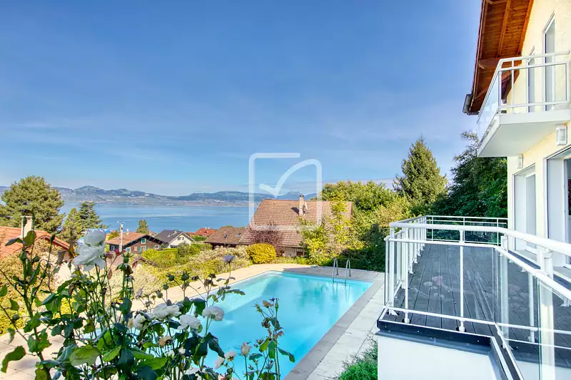 LUGRIN : Spacieuse villa contemporaine de 154 m2 édifiée en 2007, sur un terrain de 1560 m2, avec une très belle vue sur le Lac Léman. Située dans un quartier calme et recherché, à proximité des commodités et à 600m à pied du bord du lac, cette maison présente 5 pièces réparties sur 3 niveaux. Le niveau principal comprend un salon-séjour de 60 m2 avec une cuisine ouverte, donnant sur une terrasse surplombant la piscine. Lumineux grâce aux nombreuses baies vitrées, le salon offre une vue imprenable sur le lac. Cuisine américaine amenagée et équipée. À l'étage, 4 chambres, dont 2 suites (une avec une salle de bain + douche, et l'autre avec une salle d'eau), une deuxième salle d'eau, deux WC séparés, et une chaufferie. Au niveau supérieur, un grand garage double avec portes motorisées et 4 places de stationnement dans la cour. Les prestations comprennent des volets roulants automatiques, la fibre optique, un chauffage au sol dans la pièce de vie, une chaudière récente, et un adoucisseur d'eau.