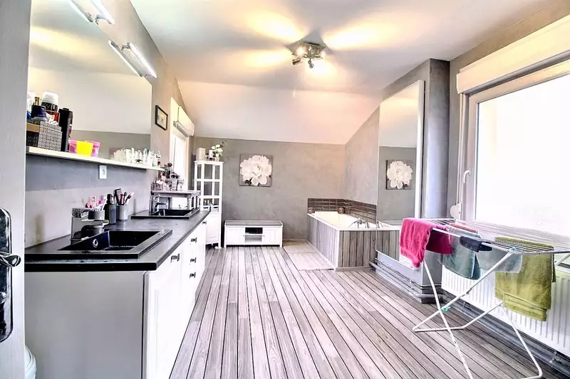 -Salle de bain moderne : Comprenant une douche, une baignoire, un meuble double vasque et des toilettes, conçue pour répondre aux besoins quotidiens de toute la famille.