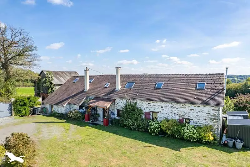 Maison en pierre rénovée, au calme et sans voisin proche. Elle offre un salon, cuisine aménagée et équipée lumineuse, buanderie, chambre et salle d'eau avec WC au rez-de-chaussée. A l'étage, 3 chambres, 2 salles d'eau avec WC. Terrain arboré et clos d'environ 4400m², à 10 min des commerces.