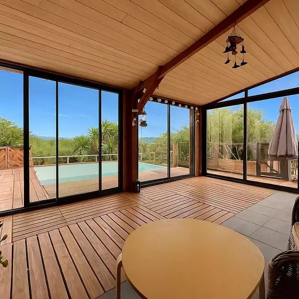 • Une pièce de vie lumineuse donnant sur une véranda de 18 m², baignée de lumière, ouverte sur la piscine, idéale pour vos moments de détente en famille ou entre amis.