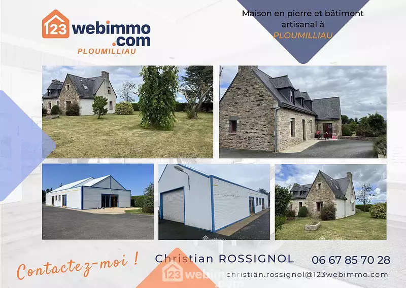 Une maison en pierre pleine de charme, accompagnée d'un atelier indépendant de 255 m², le tout implanté sur un vaste terrain clos de 2 500 m² à seulement 1,2 km du bourg de Ploumilliau et 10 minutes des plages.