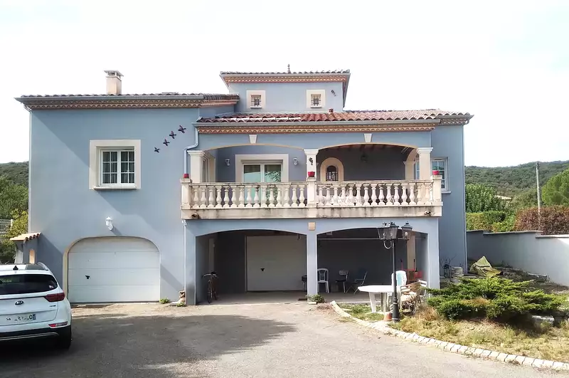 Villa de 155 m2 habitables sur 1637 m2 de terrain cloturé et arboré + dépendance de 20 m2 pouvant servir de studio indépendant. Comprenant au rez de chaussée : deux garages, caves, chaufferie pour une surface totale de 140 m2. Au 1er étage : hall d'entrée, séjour de 44 m2 avec cheminée insert, cuisine équipée ouvrant sur une terrasse en partie couverte, deux chambres d'environ 15 m2, vaste salle d'eau avec douche et baignoire d'angle + au niveau superieur une mezzanine pouvant servir de bureau, une sde à créer, une chambre . Chauffage central au fioul par le sol + climatisation gainable.