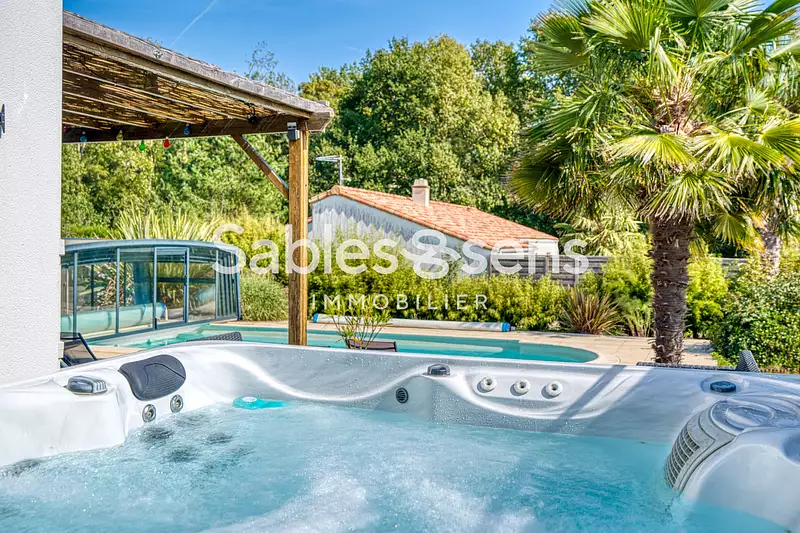 Votre agence Sables&Sens vous propose dans sa vitrine Vivre&Imagine, dans un quartier résidentiel recherché, une belle maison de plain-pied de 155 m2, qui vous offrira un cadre de vie paisible et verdoyant. Édifiée sur un terrain arboré et paysagé de 1 282 m2, elle allie confort, intimité et sérénité. Proche de toutes commodités et à 10 minutes des Sables d’Olonne cette maison est idéale pour une vie de famille ou une résidence secondaire.Elle se compose d'une grande pièce de vie lumineuse avec cuisine américaine entièrement équipée, d'un salon de lecture (pouvant être transformé en cinquième chambre) ; de quatre chambres, une salle de bain, deux salles d'eau, trois WC, d'un garage ainsi que d'un carport. Côté extérieur, vous bénéficierez d'une grande piscine avec un abri haut, un jacuzzi, et d'un jardin agrémenté avec goût et raffinement. Venez découvrir avec Patrick Richaud de l'agence Sables&Sens un bien rare au coeur d'un environnement calme et familial.