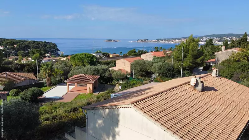Cette villa représente une opportunité d'acquisition particulièrement intéressante, notamment en tant que résidence principale. Elle offre un potentiel d'évolution exceptionnel, incluant des options telles que l'agrandissement, la division en deux logements distincts, le détachement d'une parcelle de terrain, ou même une reconstruction complète. Actuellement configurée en deux appartements, la partie supérieure est un logement de type 3 d'une superficie habitable de 90 m², avec la possibilité d'une conversion en quatre pièces. Il bénéficie d'une terrasse de 15 m² ainsi que d'une véranda de 19 m², offrant une vue imprenable sur la mer, englobant la Baie de Bandol et l'Île de Bendor. Un escalier intérieur relie la partie supérieure de la villa au rez-de-jardin.