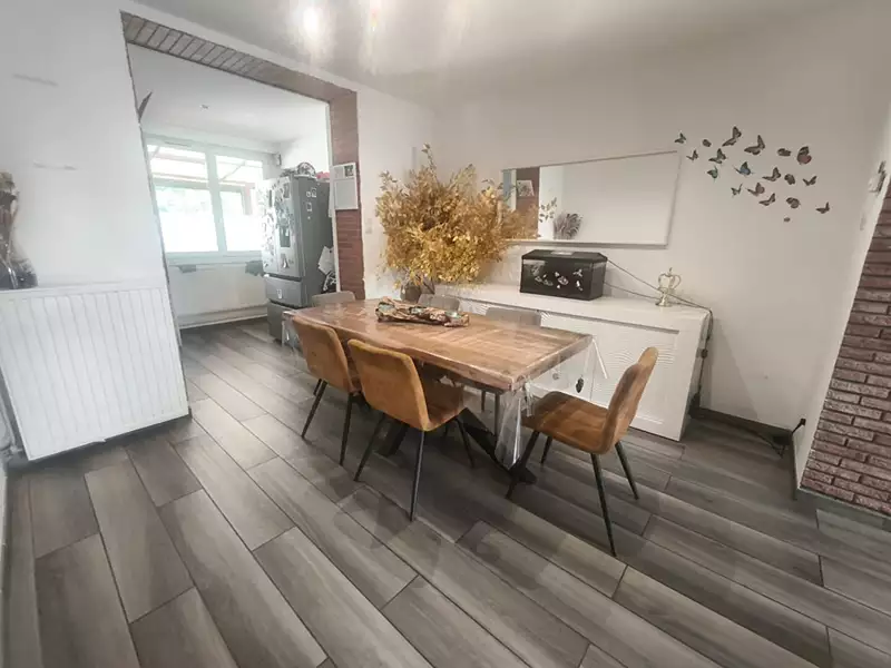 BRUAY SUR L'ESCAUT, maison INDIVIDUELLE en PLAIN PIED offrant : - Au rez-de-chaussée : Une entrée sur un grand séjour lumineux ouvert sur une cuisine équipée, une salle de bains avec douche italienne, une buanderie, un WC séparé et 4 chambres dont une de 23m² et une belle véranda chauffé d'environ 30m². A l'extérieur une terrasse, un très beau terrain d'environ 1000m² bien exposé et sans vis à vis avec une parti constructible. Passage sur le côté par portail pour plusieurs véhicules et un garage de 34m² PAS DE TRAVAUX A VISITER SANS TARDER !!! MDT 1862 DPE E en cours PRIX : 229 500 euros Frais d'Agence Inclus, les honoraires d'agence étant exclusivement à la charge des vendeurs.